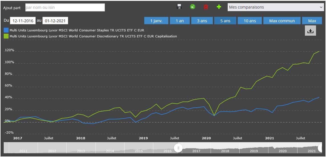 Ce sont 2 secteurs particuliers inclus dans cet indice large : « Consumer Staples » & « Consumer Discretionary ».