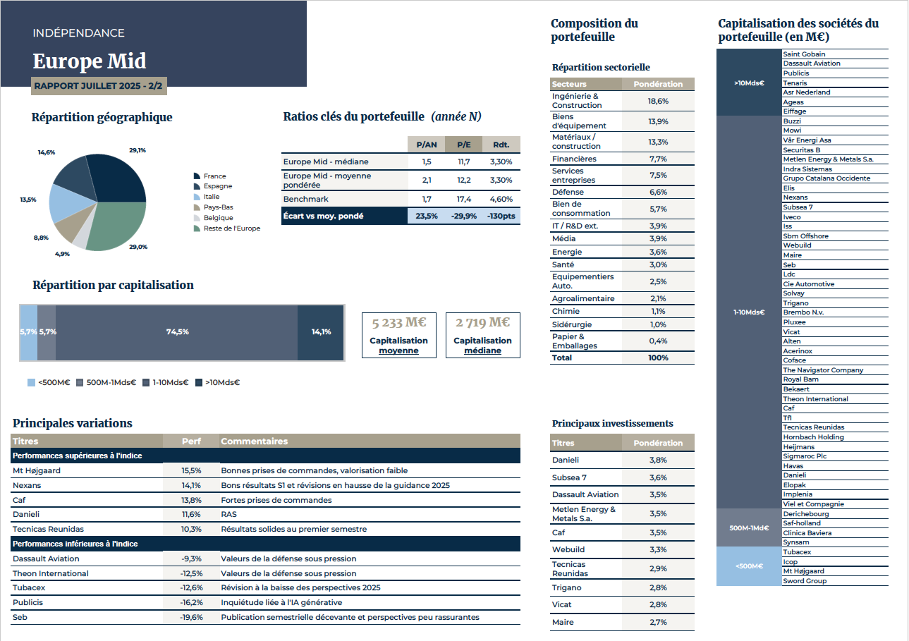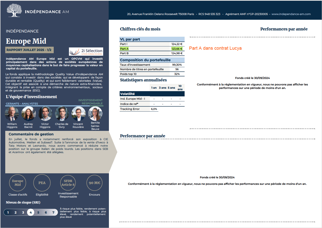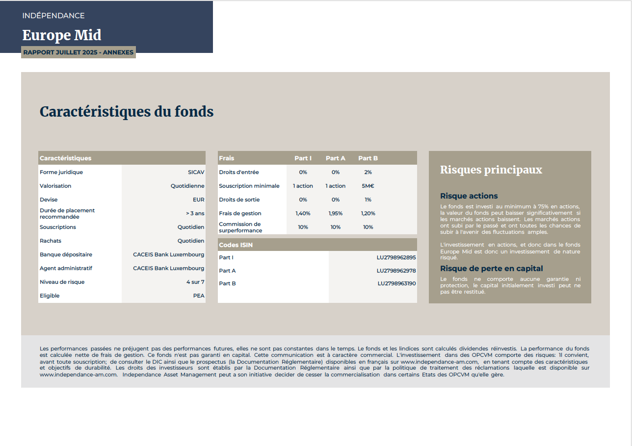 dans la continuité de diversifier mes avoirs tout en restant sur l’Europe, j’ai pris position sur le fonds LU2798962978 créé Indépendance AM le 30.09.2024 avec encours à fin juillet 2025 de 90 M€. Même équipe que pour le fonds Europe Small.