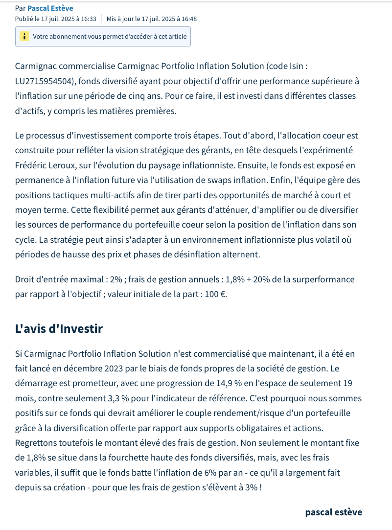 A l’ heure du 100% ETF, ca fait toujours un peu bizarre d’ envisager un fond bien chargé en frais…surtout que Carmignac est toujours très cher.