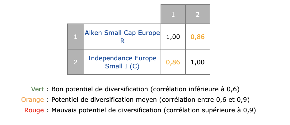 Le site de Quantalys permet de vĂ©rifier la corrĂ©lation de diffĂ©rents fonds, pour Ă©valuer le potentiel de diversification quâils apportent. Dans le cas de nos 2 fonds en question, la corrĂ©lation est de 0,86, donc sans surprise assez Ă©levĂ©e, ce qui confirme quâavoir les 2 nâapporte pas de rĂ©elle diversification.