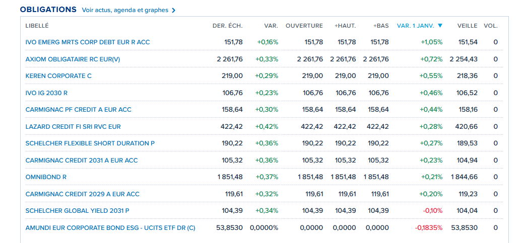 Je retiens que la prime de risque( ou spread) a pas mal baissé sauf pour les dettes émergentes => ca tombe bien car ma première ligne est IVO Emerg Mrts Corp Debt EUR R