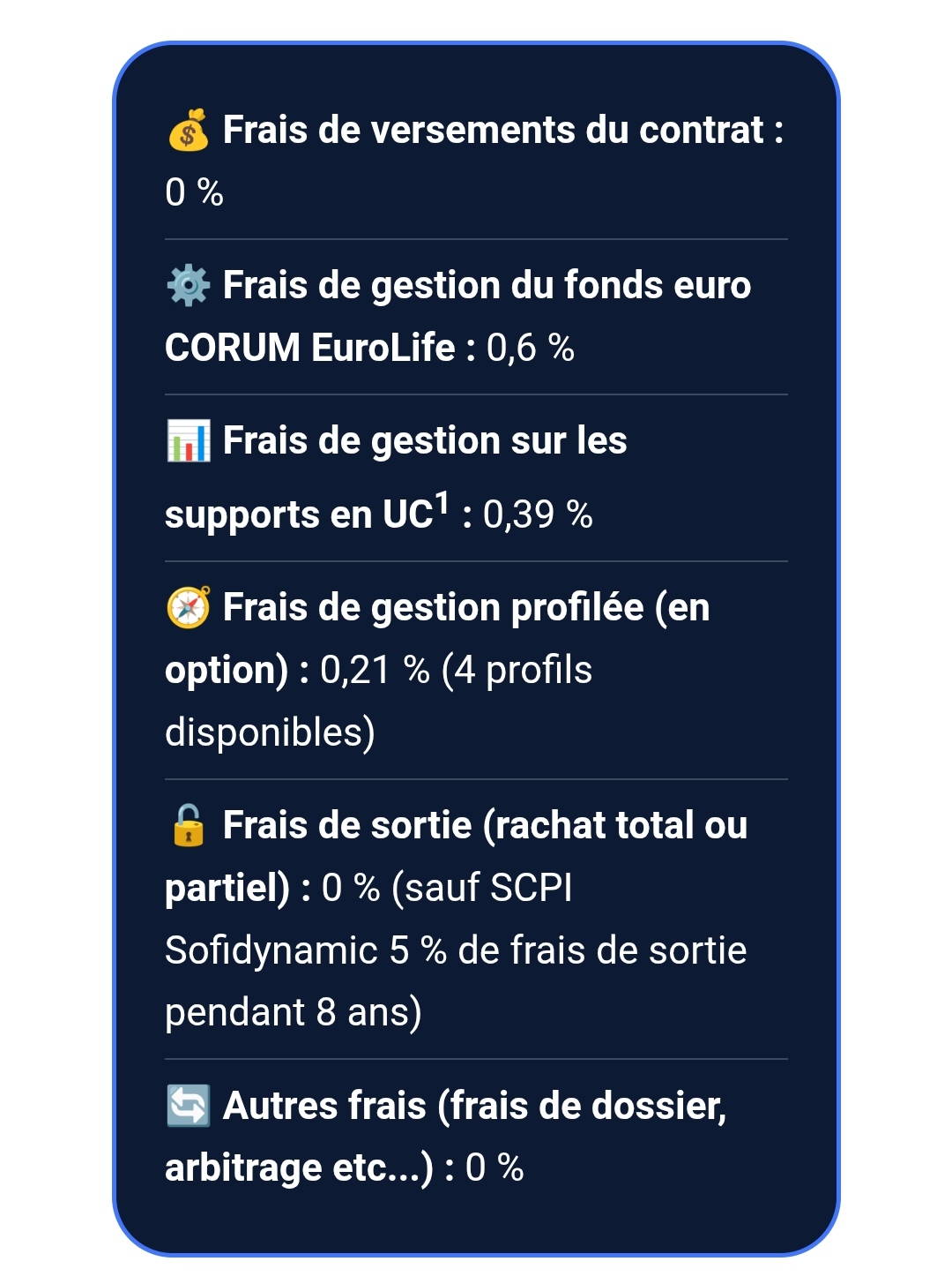 Je ne sais pas si c’est indiqué quelque part mais le contrat étant celui de l’assureur Corum Life, il est plus que raisonnable de penser qu’ils appliqueront les mêmes frais et délai de jouissance que dans leur contrat d’AV Corum Life, au moins pour leurs propres SCPI et fonds obligataires.