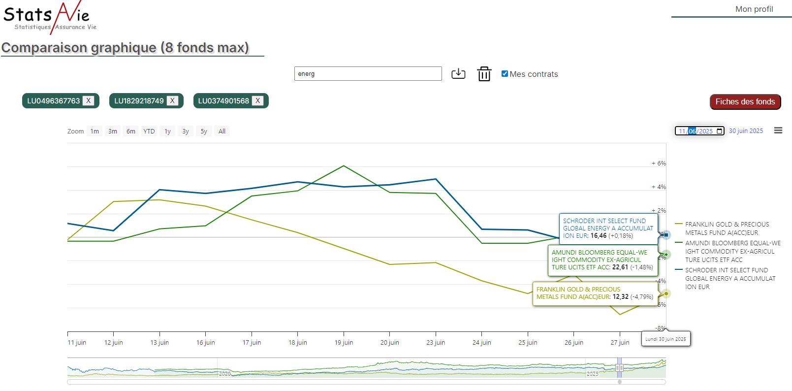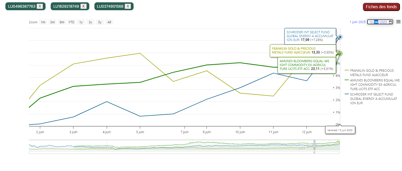 Petit retour d’observation sur juin 2025 avec la séquence géopolitique (tensions puis guerre USA–Iran–Israël), en comparant trois fonds : énergie, commodities et or.